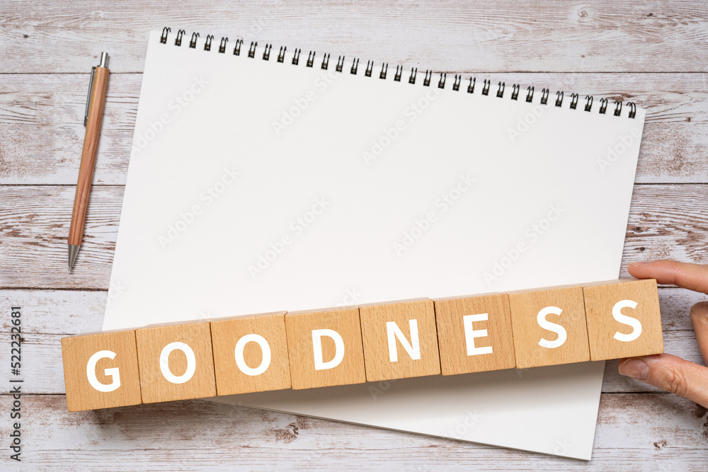 善・良好・優しさのイメージ|「GOODNESS」と書かれたブロック、ノート、ペン、手