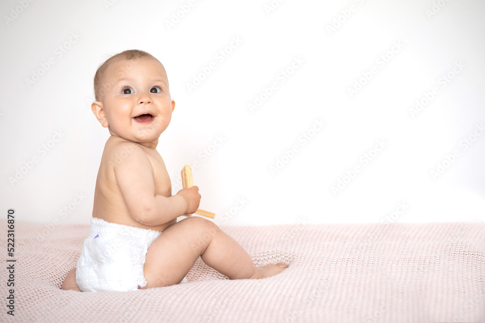 A cute little girl in a white diaper sits on a pink knitted blanket. Lifestyle. Happy Childhood. Space for text