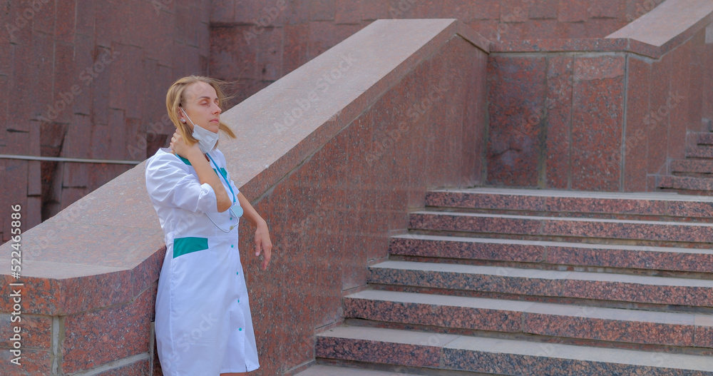 Portrait of woman doctor in protective medical face mask and sad looking.