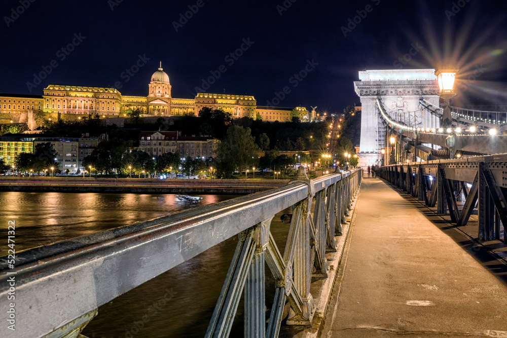 Chain bridge and Buda castle at night in Budapest