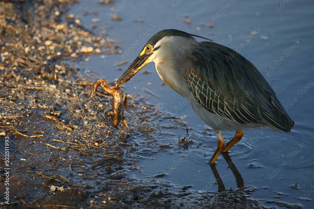 Mangrovenreiher / Green-backed heron / Butorides striatus...Grasfrosch / European common frog / Rana temporaria