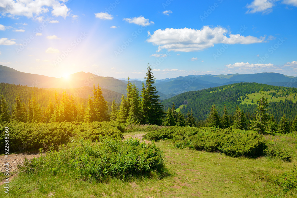 Beautiful sunrise in mountains and blue sky with white clouds.