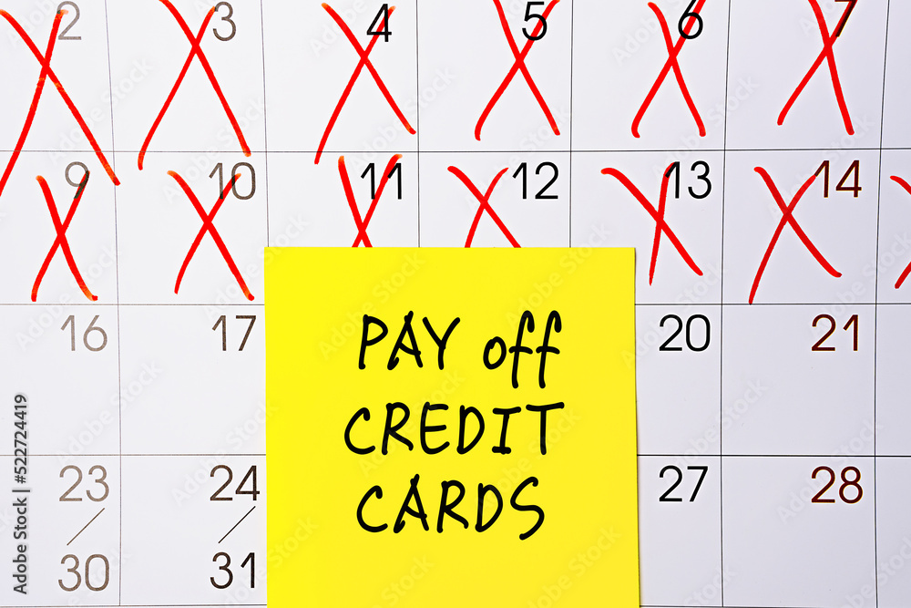 The phrase Pay off Credit cards written in black text on a yellow sticky note posted to a calendar page as a reminder. Close up of a personal agenda, topview. Motivational quote