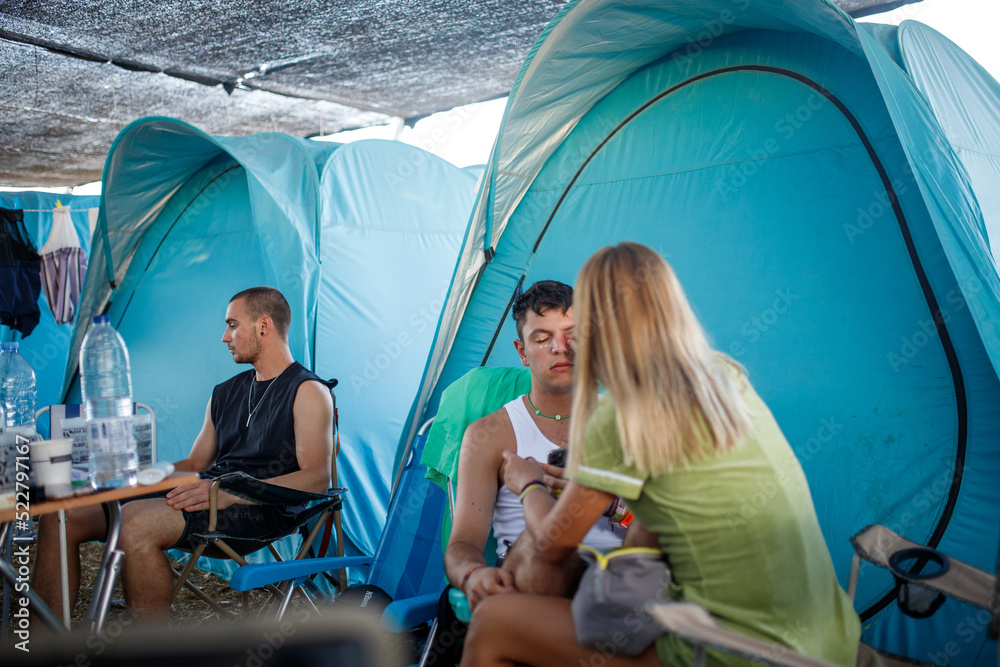 friends doing makeup at the campsite at a festival