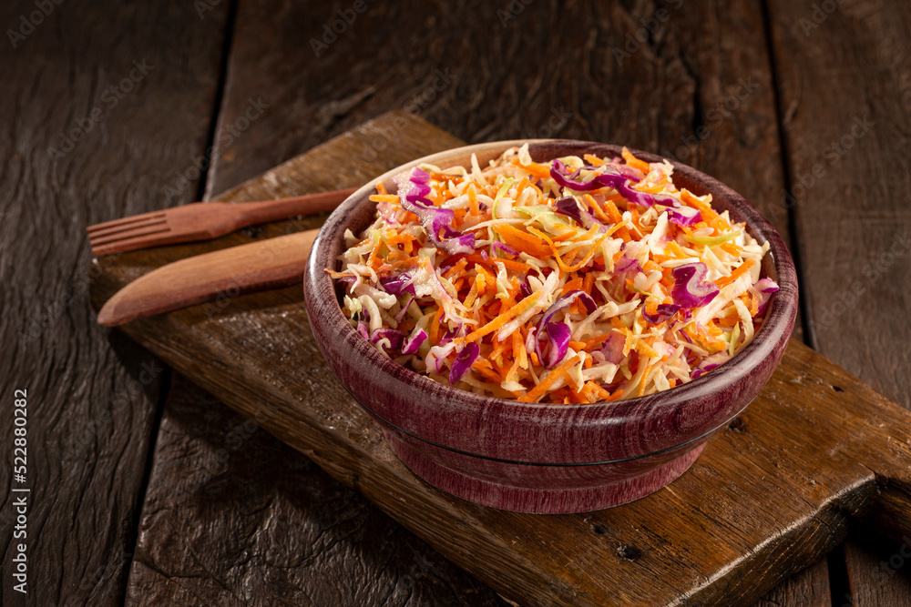 Coleslaw salad with white cabbage, red cabbage and sliced carrots.