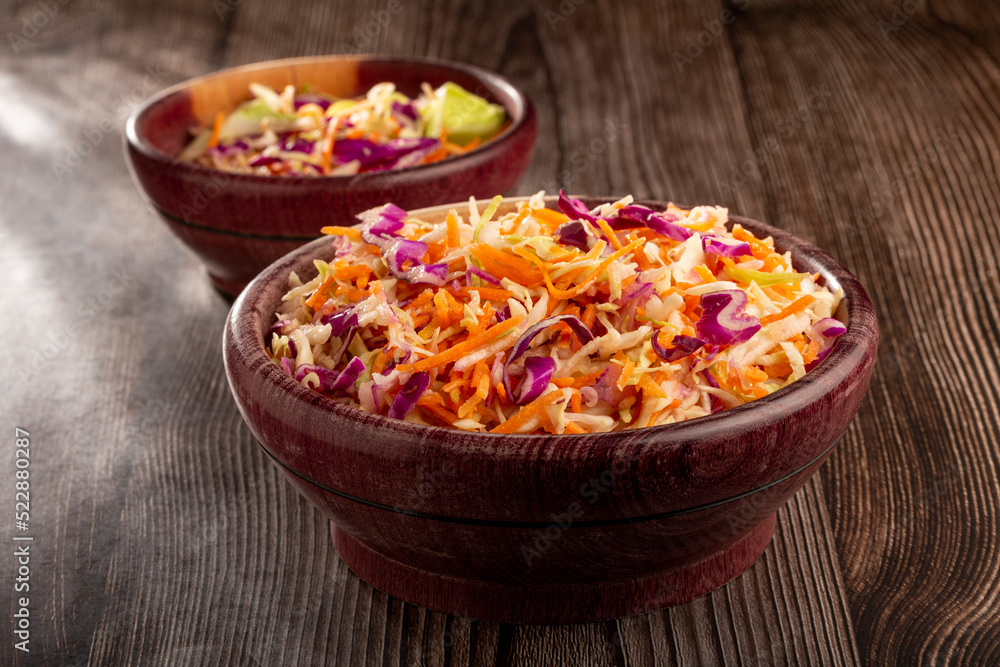 Coleslaw salad with white cabbage, red cabbage and sliced carrots.