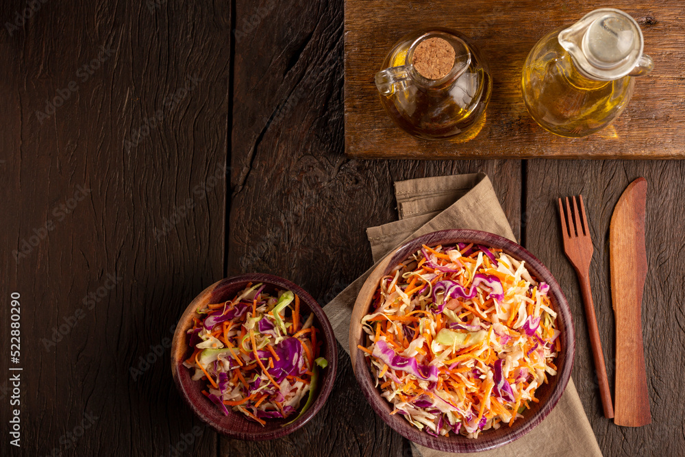 Coleslaw salad with white cabbage, red cabbage and sliced carrots.