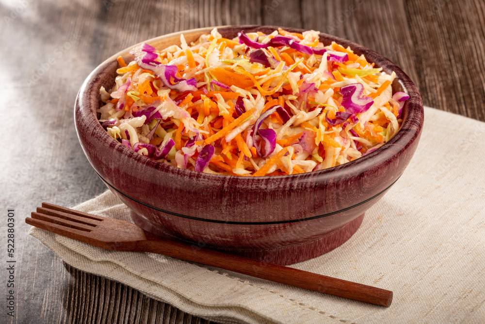 Coleslaw salad with white cabbage, red cabbage and sliced carrots.