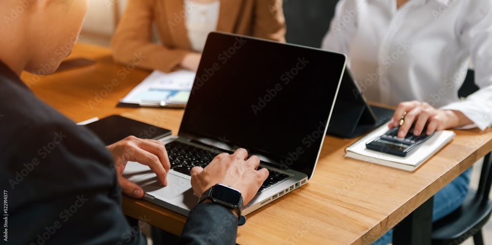 Team work process. Photo young business crew working with new startup project. Project managers meeting. Analyze plans, papers. At office.