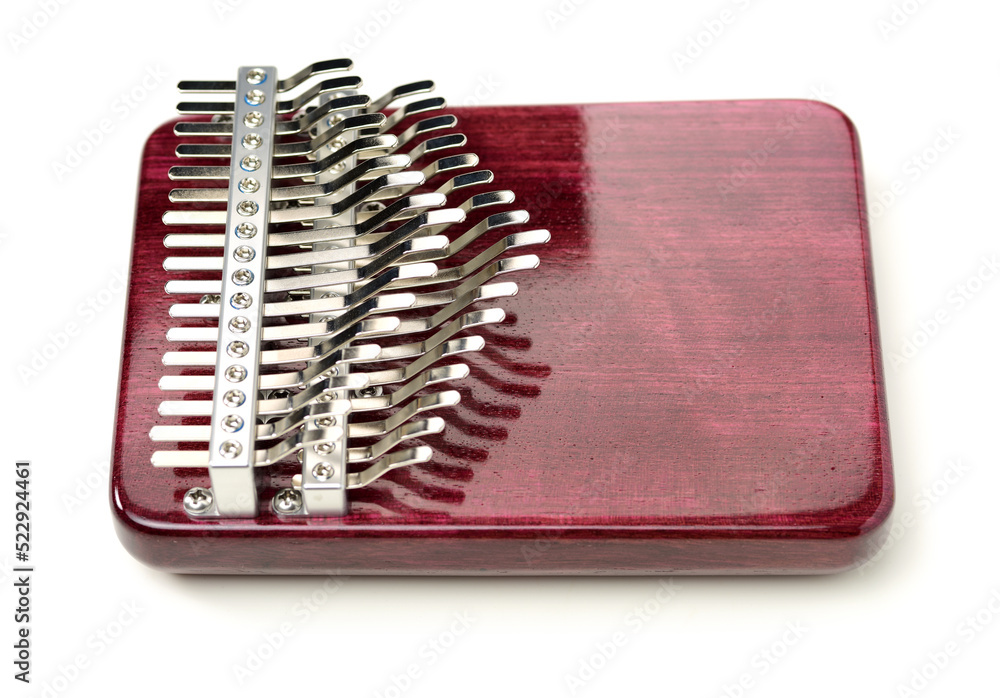 Top view wooden african instrument Kalimba musical isolated on white background. play on hands and plucking the tines with the thumbs