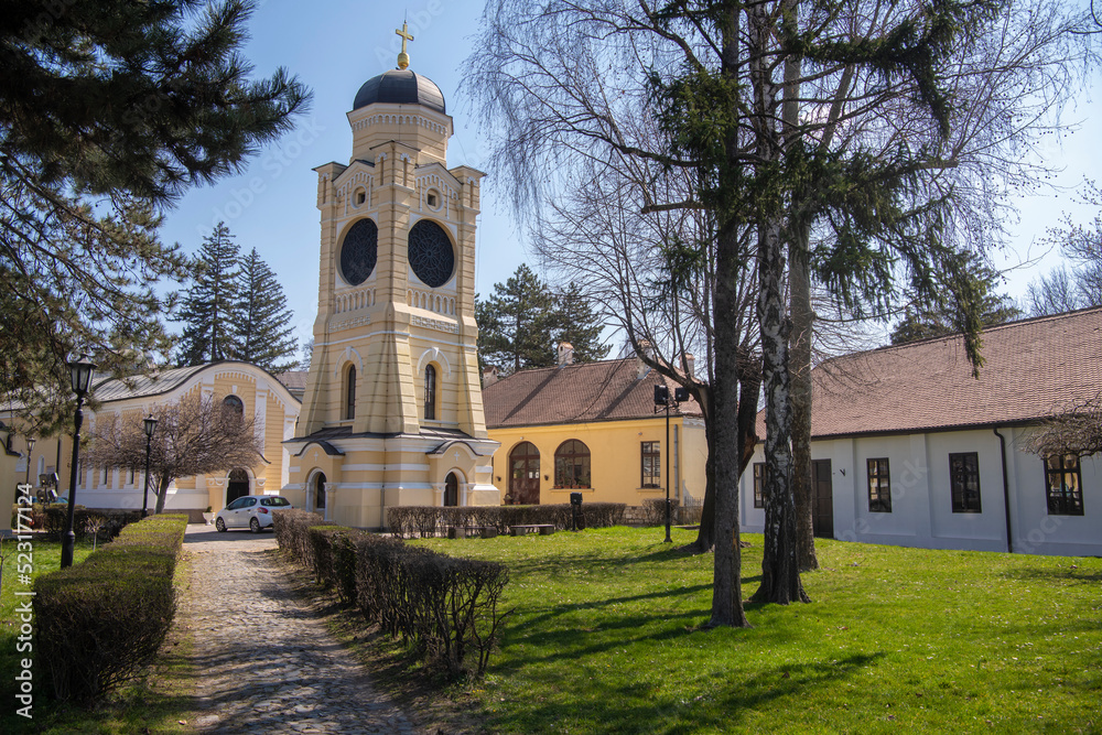 Old church and temple of the Holy Trinity (Hram Svete Trojice). Beautiful view on belltower of orthodox church in the city of Kragujevac, Serbia 26.03.2022