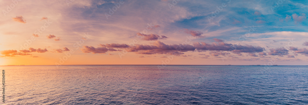 Closeup sea horizon beach. Amazing seascape. Inspire tropical ocean waves horizon. Abstract golden sunset sky clouds tranquil relaxing sunlight summer freedom. Vacation banner, travel nature panorama