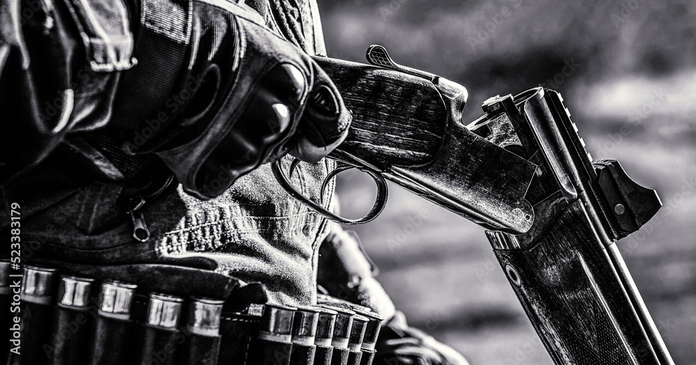 Hunter man. Hunting period, autumn season. Male with a gun. A hunter with a hunting gun and hunting form to hunt in an autumn forest. The man is on the hunt. Hunter with a backpack and a hunting gun