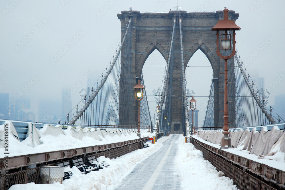 A path is cleared on the pedestrian walkway of the Brooklyn Bridge during a snow storm