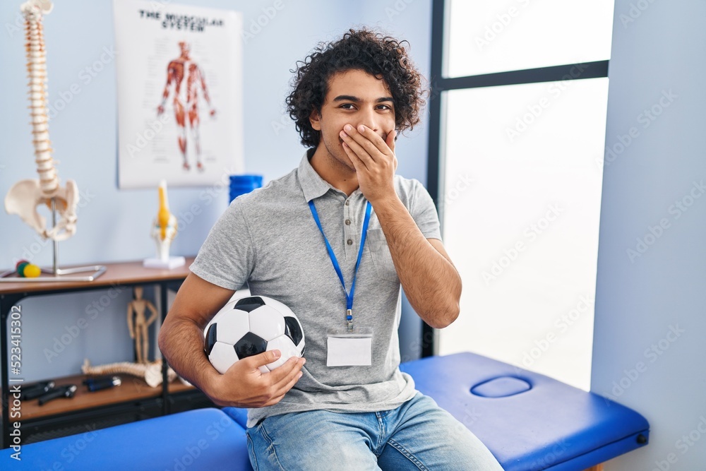 Hispanic man with curly hair working as football physiotherapist laughing and embarrassed giggle covering mouth with hands, gossip and scandal concept