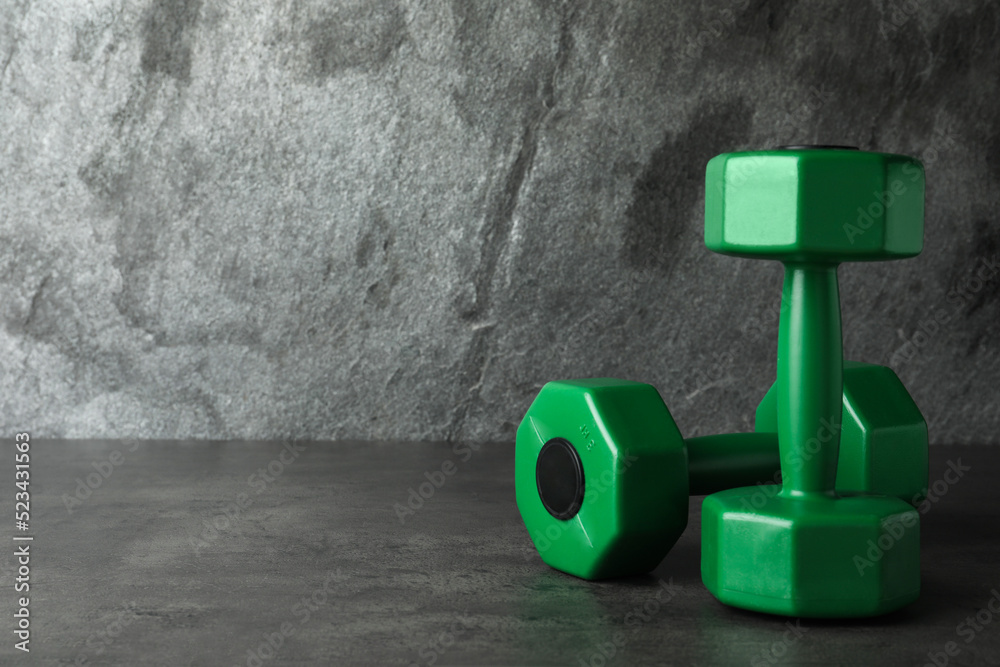 Green vinyl dumbbells on table against grey background. Space for text