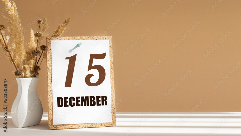 december 15. 15th day of month, calendar date.White vase with dead wood next to cork board with numbers. White-beige background with striped shadow. Concept of day of year, time planner, winter month
