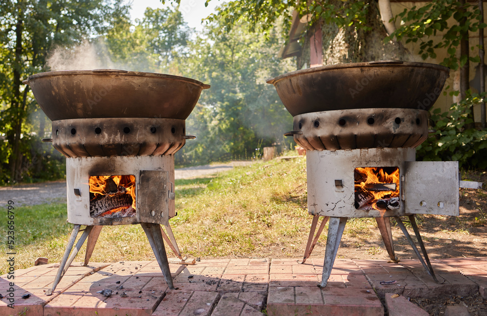 Hiking pot, Bowler in the bonfire. in cauldron at the stake. Traveling, tourism, picnic cooking, cooking at the stake in a cauldron, fire and smoke.