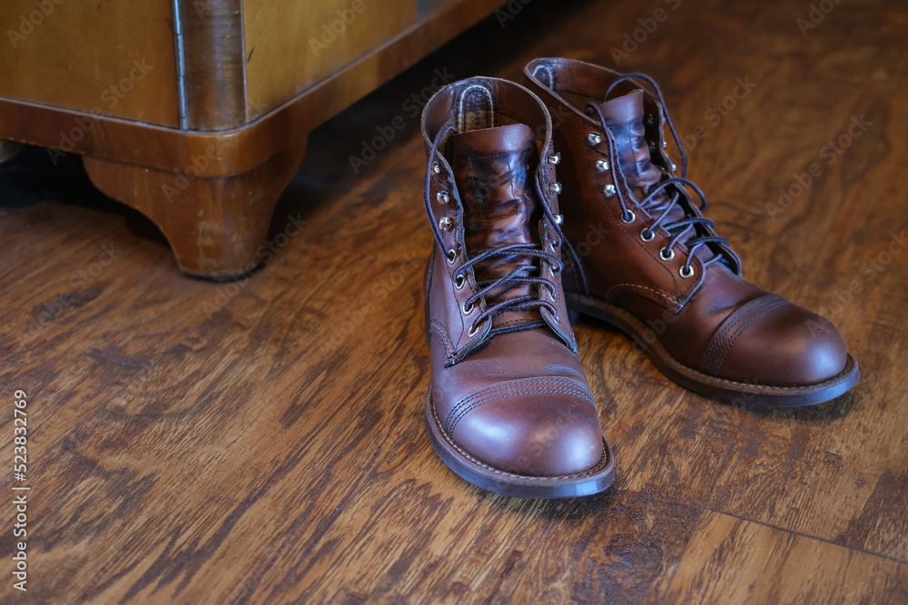 pair of rough leather boots on wooden floor on background of wooden vintage cupboard