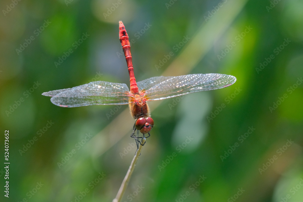 Red dragonfly on a green leaf. Macro photography showing of eyes and wings details.