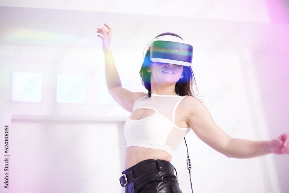 A beautiful slim brunette wearing a VR headset in a futuristic setting with flares