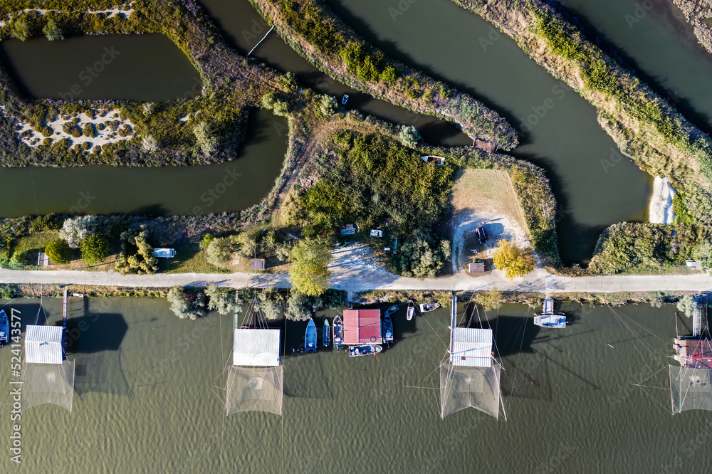 Aerial view of fishing lodges, Comacchio lagoon on sunset, Northern Italy