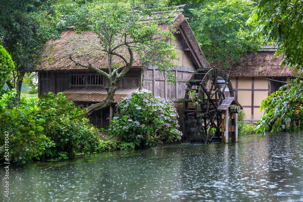 緑の樹木に覆われた雨の中の3つの水車小屋と静かな流れの小川