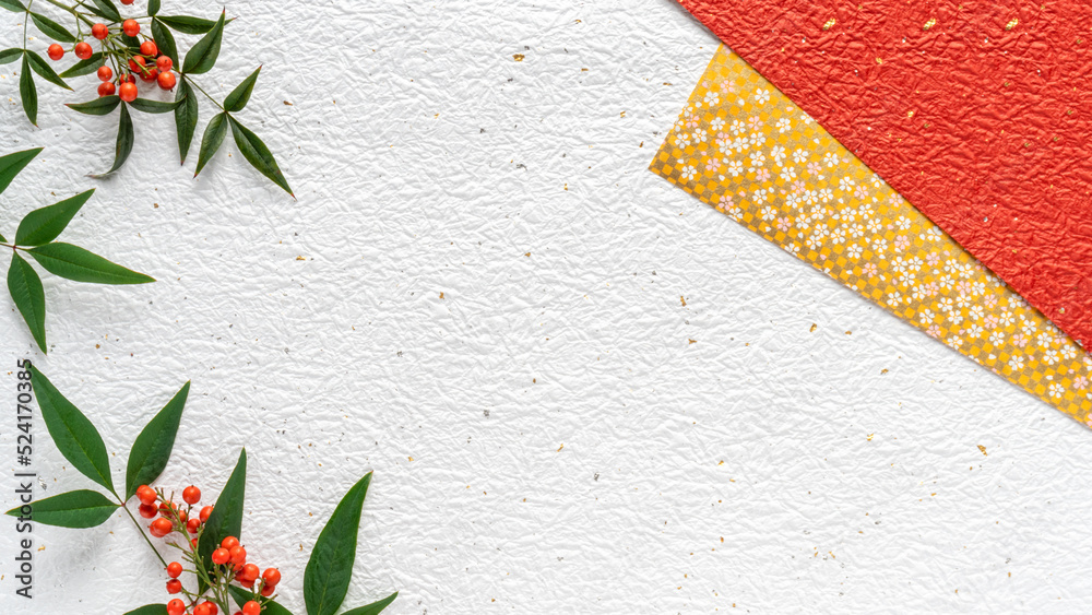 白と赤金の和紙に南天の葉と赤い実の和風背景 年賀状素材