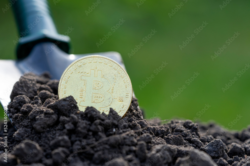 The concept of extraction and mining of cryptocurrency. Bitcoin dug up in the ground