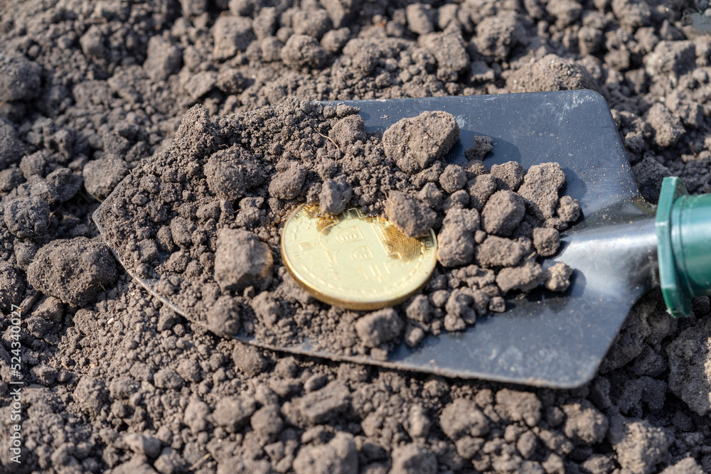 The concept of extraction and mining of cryptocurrency. Bitcoin dug up in the ground