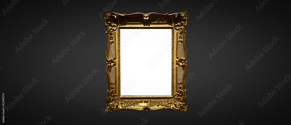 Antique art fair gallery frame on royal black wall at auction house or museum exhibition, blank template with empty white copyspace for mockup design, artwork concept