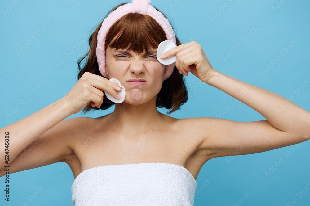 a funny, funny woman makes a funny grimace, rubbing her face with cotton pads. Horizontal Studio Photography