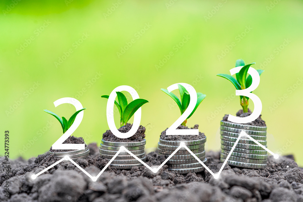 2023 concept with green sprouts growing from silver coins. Symbolizes growth and prosperity in the new year. The money tree grows from money.