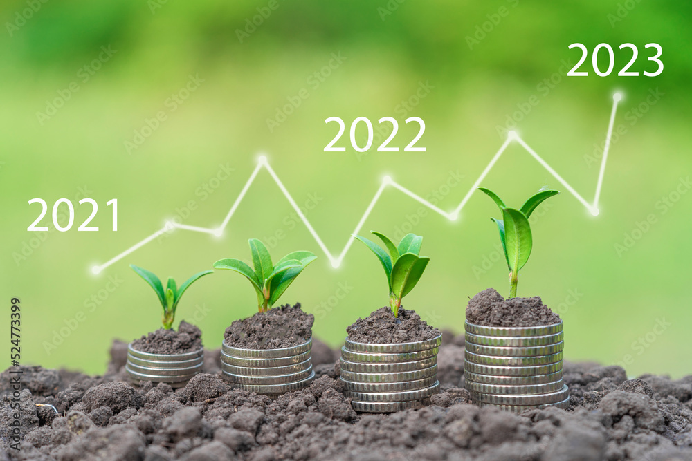 2023 concept with green sprouts growing from silver coins. Symbolizes growth and prosperity in the new year. The money tree grows from money.