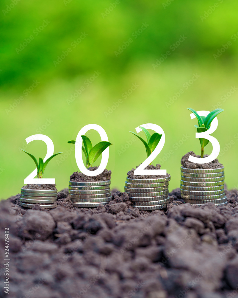 2023 concept with green sprouts growing from silver coins. Symbolizes growth and prosperity in the new year. The money tree grows from money.