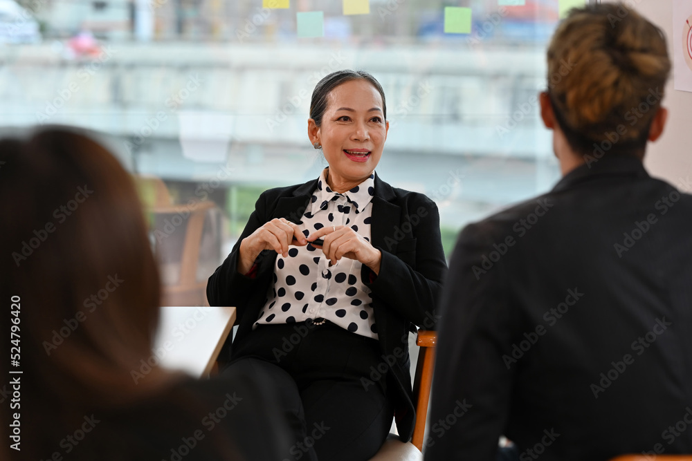 Senior old age CEO businesswoman mentor listening presentation business plan or strategy in the conference with business team.