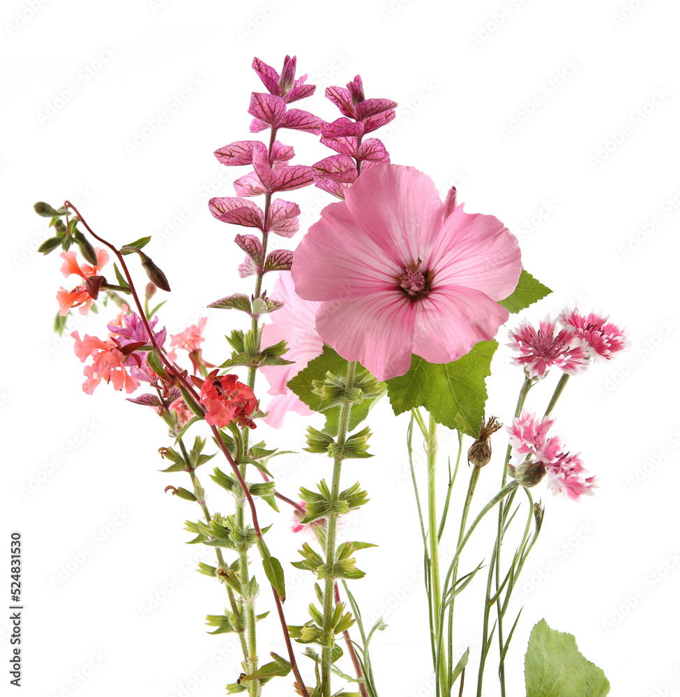 Pink garden flowers: rose mallow, sage and cornflowers isolated on white background. Malva trimestris, Salvia viridis, Centaurea cyanus.