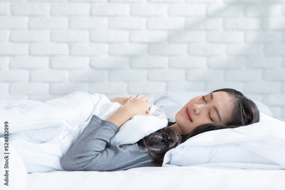 Beautiful Attractive Asian woman sleep and sweet dream lying on bed in cozy bedroom in the morning feeling so relax and comfortable.Healthy Young female sleep with bedtime at home.Healthcare Concept