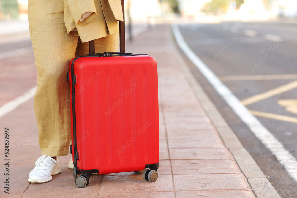 Cropped image of traveler tourist woman in yellow clothes with red suitcase waiting taxi cab in city outdoor. Girl traveling abroad on weekends getaway. Tourism , business journey lifestyle concept.