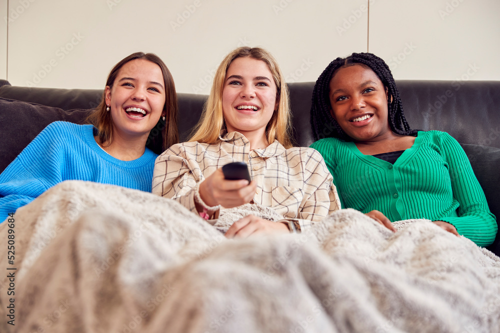 Group Of Multi-Cultural Teenage Girl Friends Snuggled Under Blanket Watching TV At Home