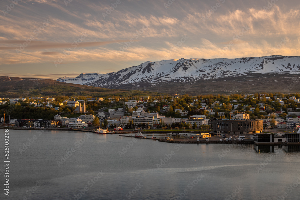 Beautiful view of Akureyri’s Old Town at Sunset from a high point in a summer day.