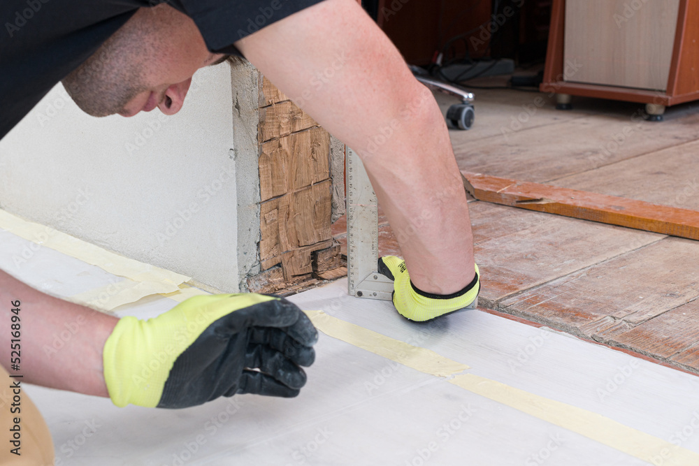 Installation of interior doors, measurement of the vertical plane using a level when installing the door.
