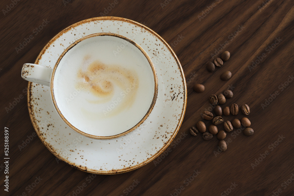 Сup of cappuccino with coffee beans on a brown wooden table, top view