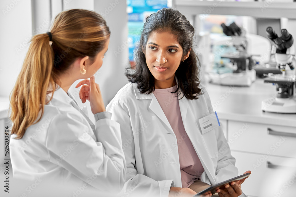 science research, work and people concept - international female scientists with tablet pc computer working in laboratory
