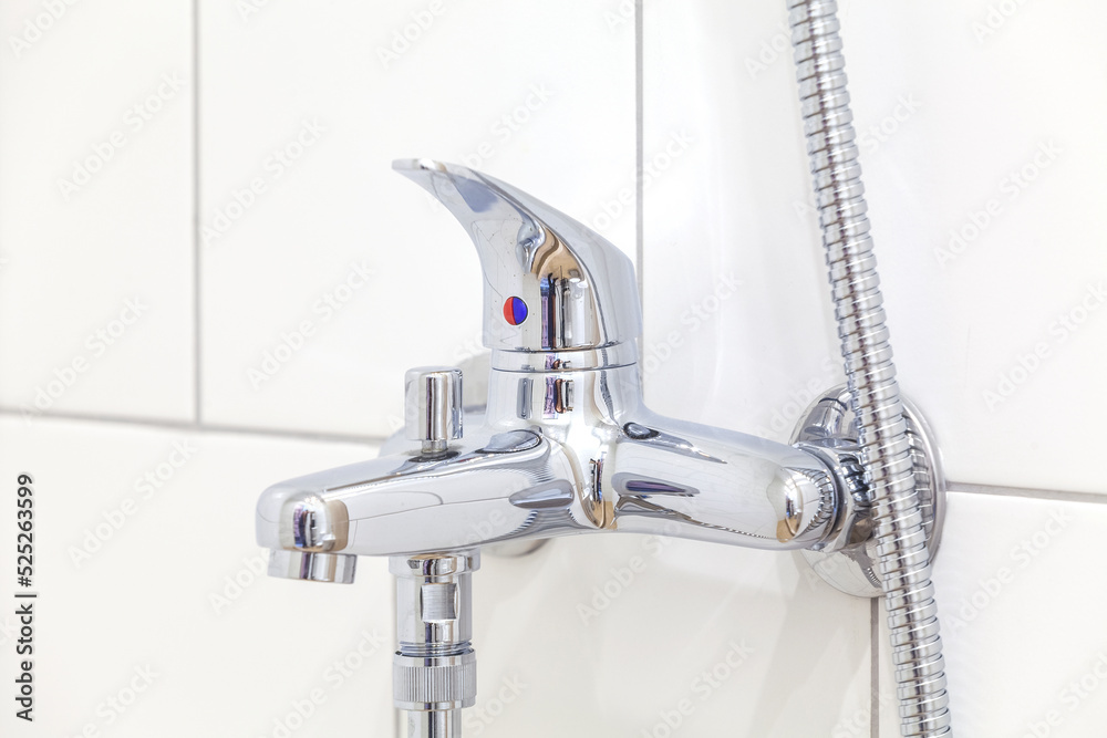 Close-up of chrome shower, faucet, in the bathroom covered decorative ceramic tiles with white glossy bricks