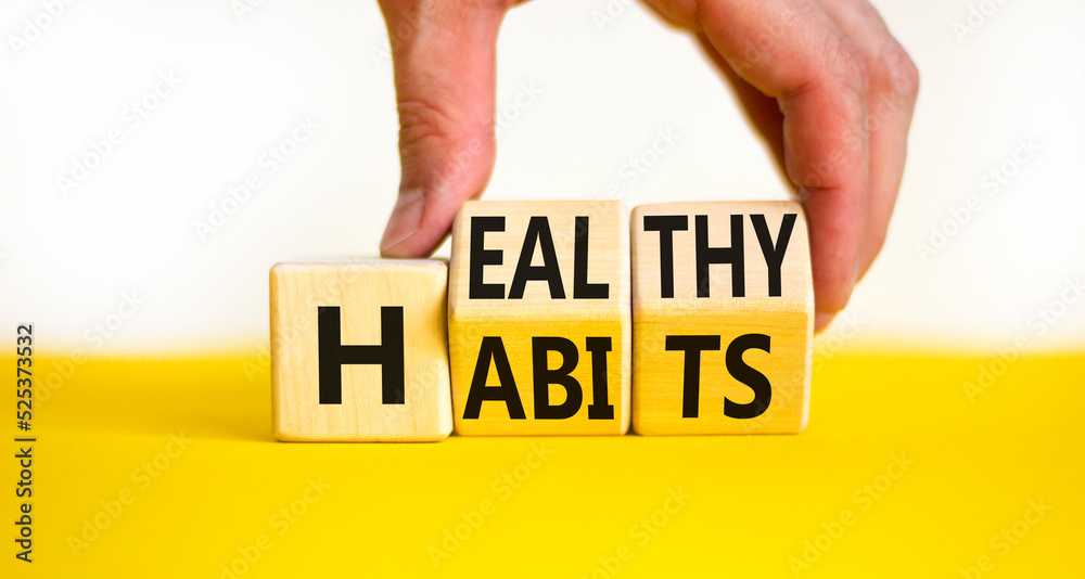 Healthy habits symbol. Concept words Healthy habits on wooden cubes. Doctor hand. Beautiful yellow table white background. Medical and healthy habits concept. Copy space.