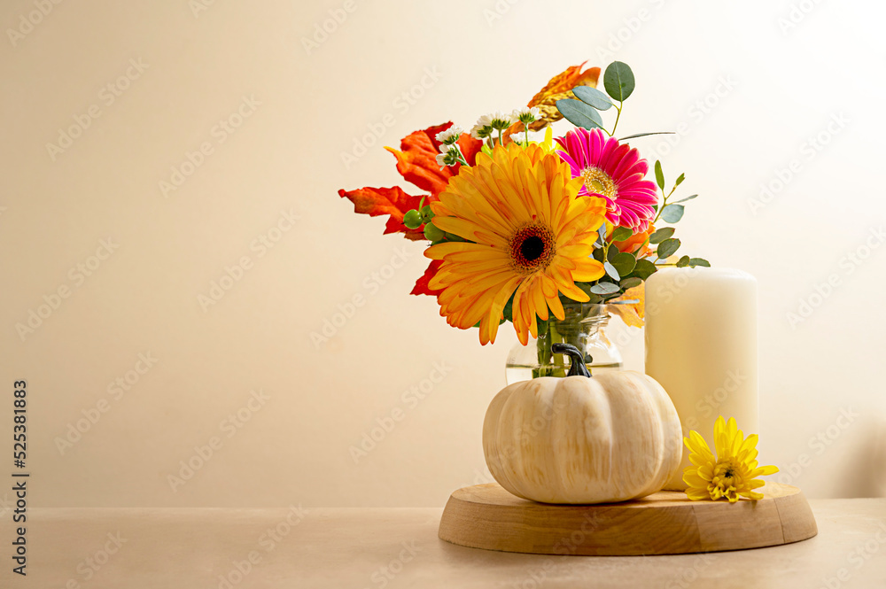 Stil life flowers and pumpkin. Bouquet of fresh flowers, candle and decorative pumpkins. Autumn colorful abstract background.