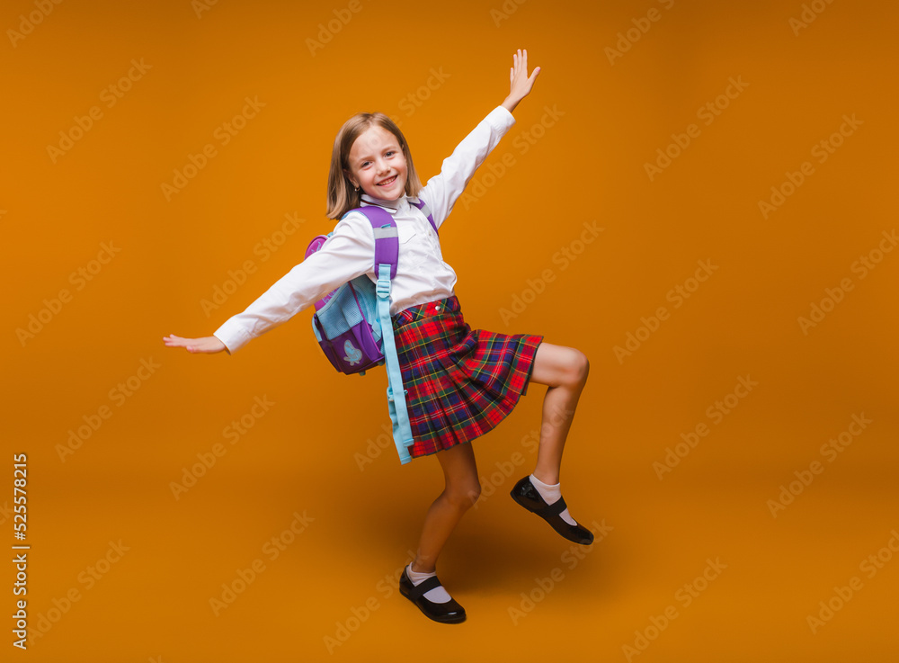 Cute happy schoolgirl in uniform walking on a yellow background. a child with a backpack. the little girl is ready for school. Dynamic images. back to school
