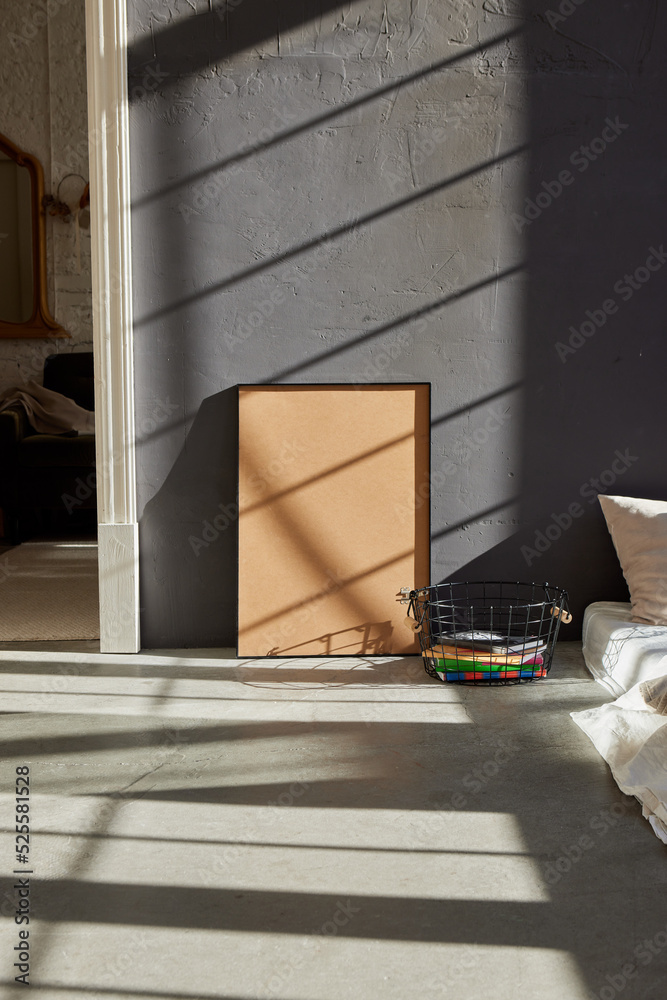 Empty frame and metal basket with notebooks place near mattress on floor in room with sunlight
