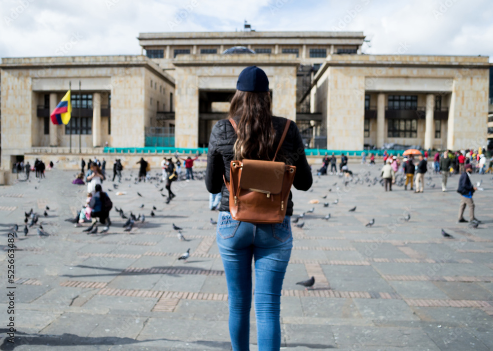 Mujer admirando, mujer de espaldas admirando palomas en la plaza